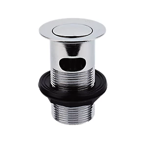 Modern basin waste with chrome-plated brass top. Internal spring plug pops up and down with each press. No need for chain.